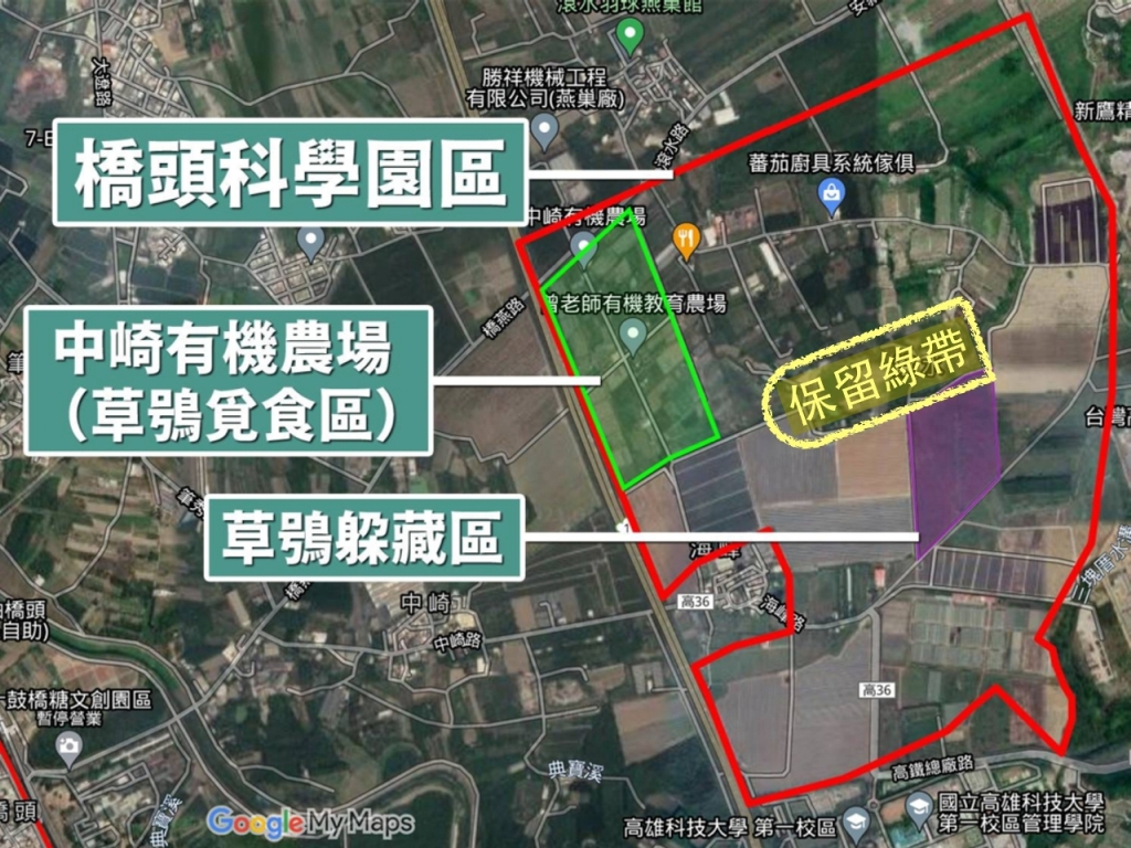 地球公民基金會主任黃斐悅表示,南科管理局並未依照一階環評的審查結論要求,在進入二階的階段提出有效的草鴞保育措施,且到了第三次審查會,仍無修改,若就此倉促通過環評,將代表橋科這個二階環評案比許多一階環評更草率。目前南科局保留的14公頃綠地是泥火山公園,並非按照草鴞調查結果規劃出來的空間,實際的覓食區及躲藏區都將被廠房取代,而若隱蔽性及食物來源(鼠類)大幅減少,草鴞很可能在此消失。當初一階環評結論明確要求「擬具保育類物種之保育措施及補償計畫」,本案最亟需處理的瀕滅物種,就是可能僅剩五百隻的草鴞,強烈要求環評委員應等看到南科局重新針對該物種的特性提出有效的保育計畫,才能通過本案。