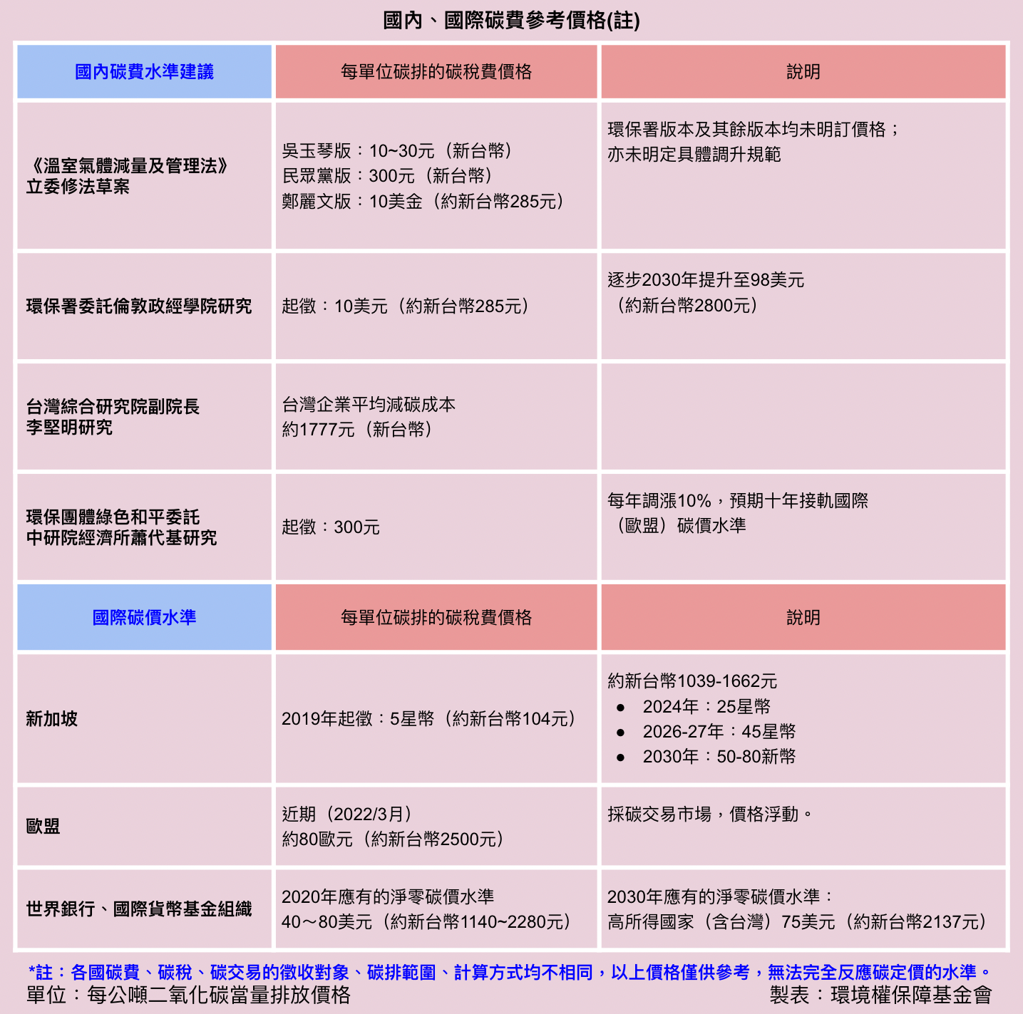 國內、國際碳費參考價格(註)