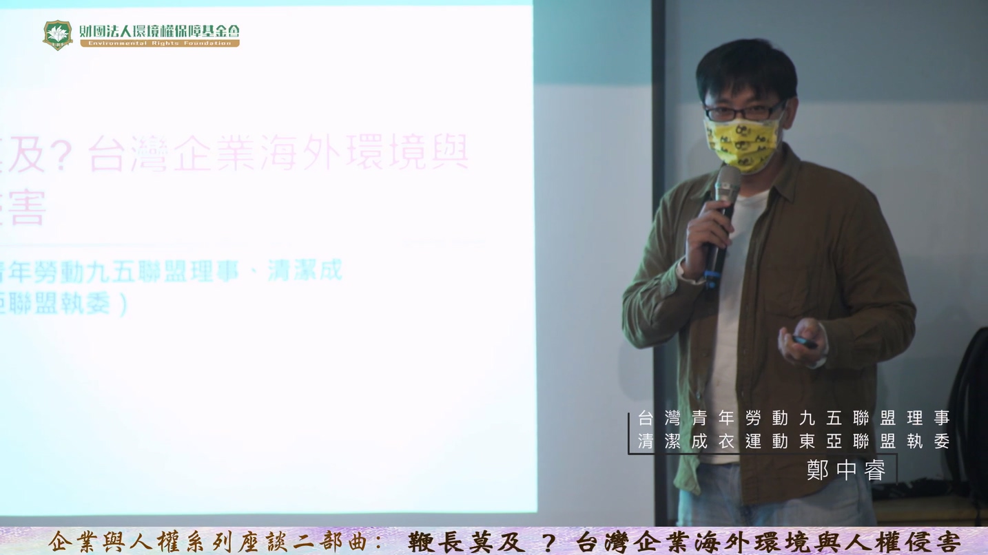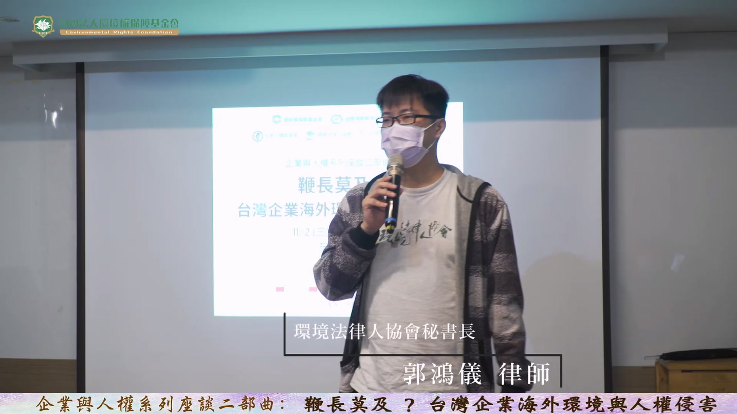 台灣企業在全球供應鏈中扮演重要角色,影響深入世界各地,包含難以監督的遠洋漁船上、以女性為大宗的縫紉場中、以及環境與人權立法與執法相對落後的國家,但本土企業在海內外造成的環境與人權侵害,卻未見完善制度對其進行管理。11月2日,環境權保障基金會、全國律師聯合會環境法委員會、台灣人權促進會、台灣青年勞動九五聯盟、環境法律人協會等團體舉辦「鞭長莫及?台灣企業海外環境與人權侵害」座談,討論台灣漁業、成衣業、鋼鐵業等對環境與人權造成的侵害,以及完善的盡職管理法可以如何有效預防或減少此類侵害。