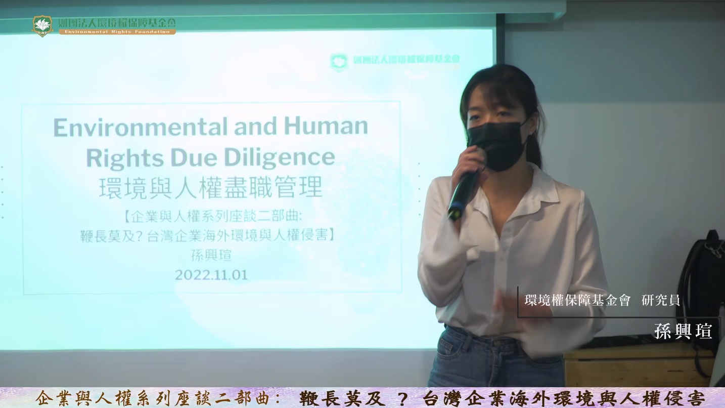 環境權保障基金會研究員孫興瑄則從整體制度面來探討,其特別指出現在台灣社會較熟悉的企業社會責任跟盡職管理其實不同,要講盡職管理要從聯合國工商企業與人權指導原則談起,在指導原則中,企業要做到盡職管理,盡職管理是一套流程,從一開始的評估與辨識、整合與行動,到後面的追蹤與監測、揭露與溝通。孫興瑄補充,評估與辨識指的是,任何企業行為前都要評估行為對當地環境、人權造成的負面影響及風險,負面影響包含實在或潛在的,風險則是企業對外部產生什麼影響。整合與行動,則是將這些負面影響辨識出來後,必須將其納入公司政策中,現在有些公司把企業社會責任放永續部或媒體部,這樣是不夠的,應融入整個企業中。