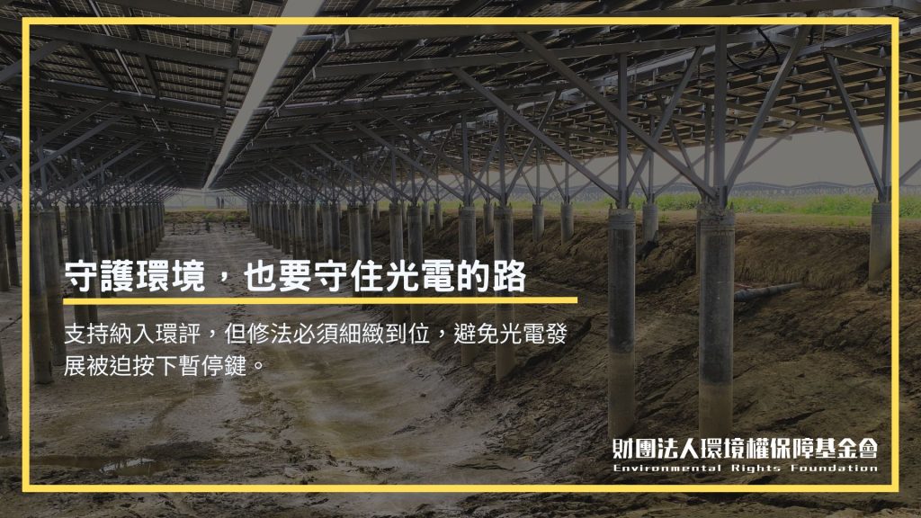 我們支持光電環評應納入修法,但修法內容應完善,否則恐造成光電發展全面停滯。就目前草案我們建議如下,期待立法院能有效衡平發展光電的需求和光電所帶來的環社影響:
