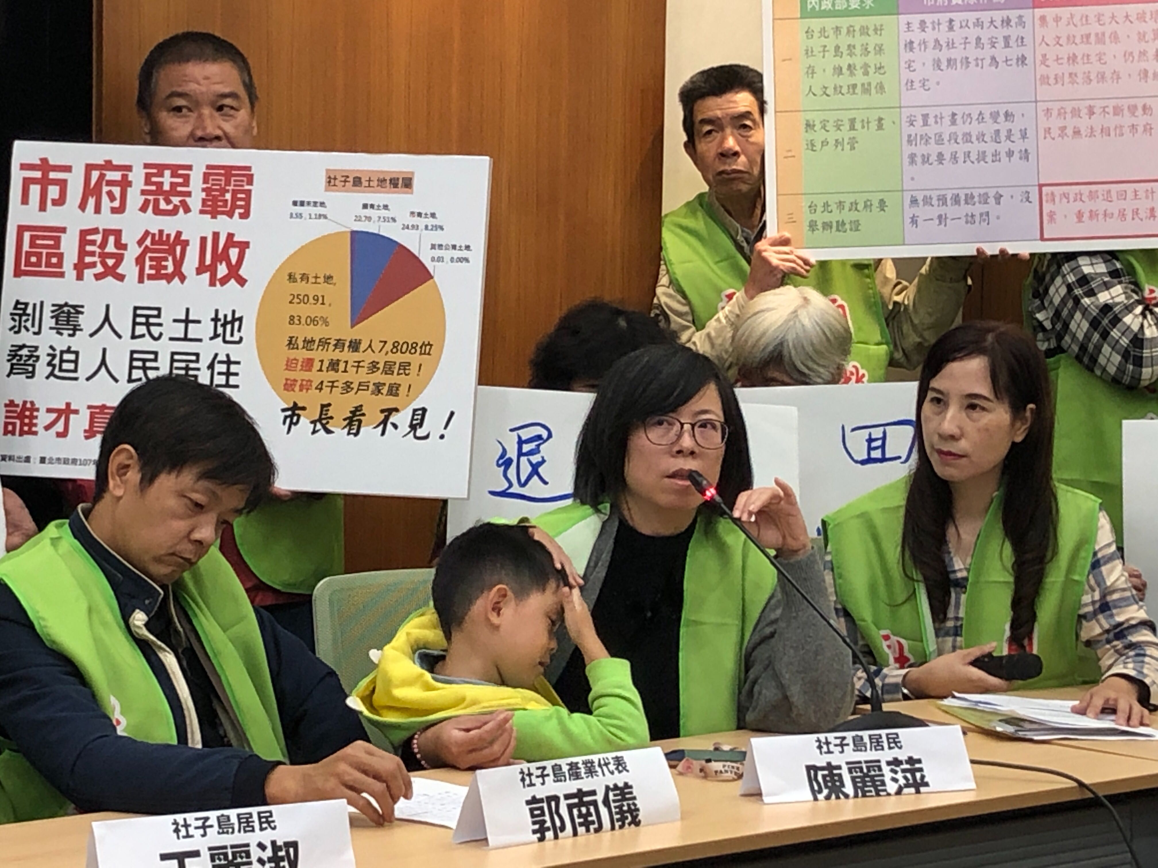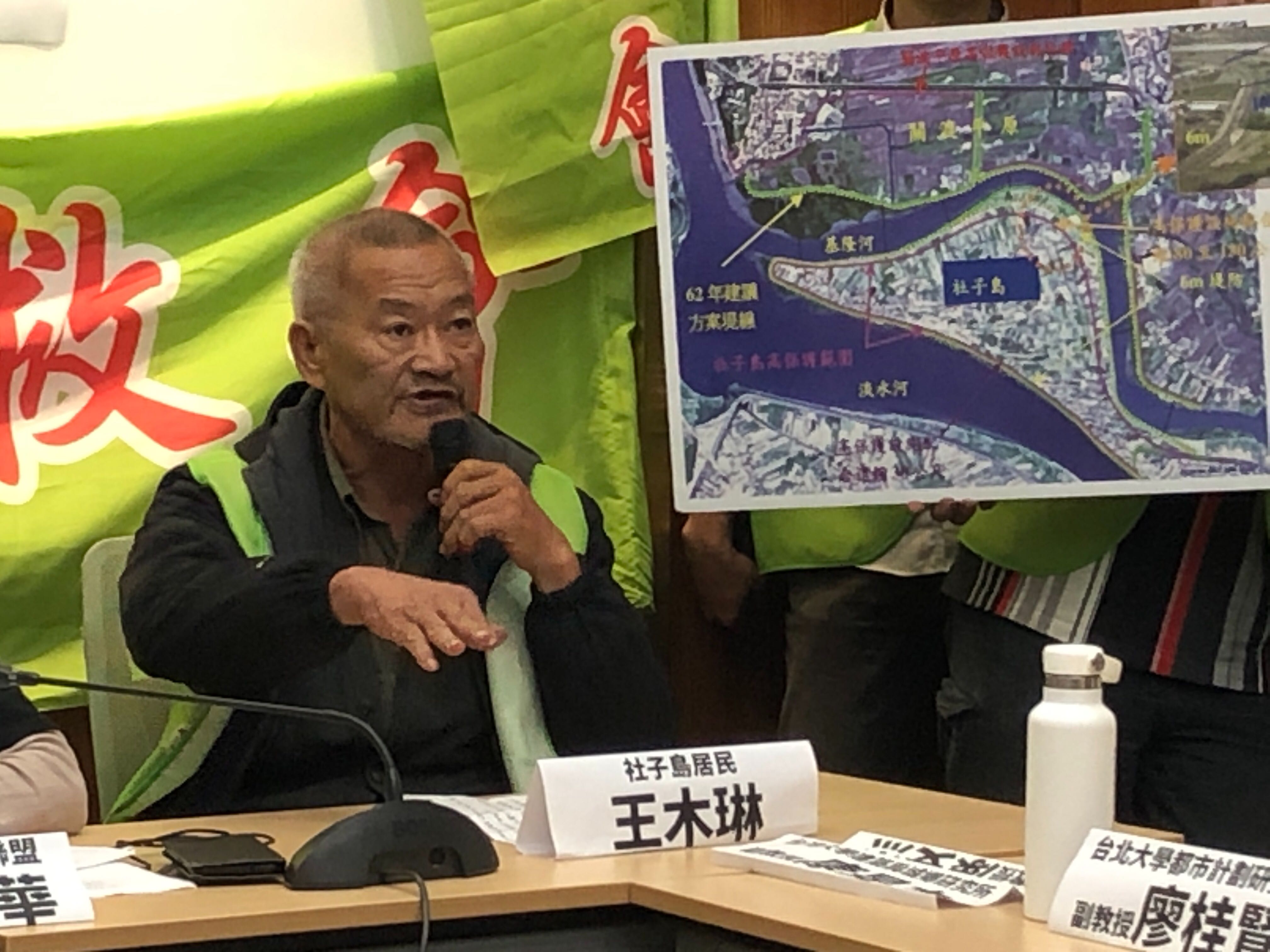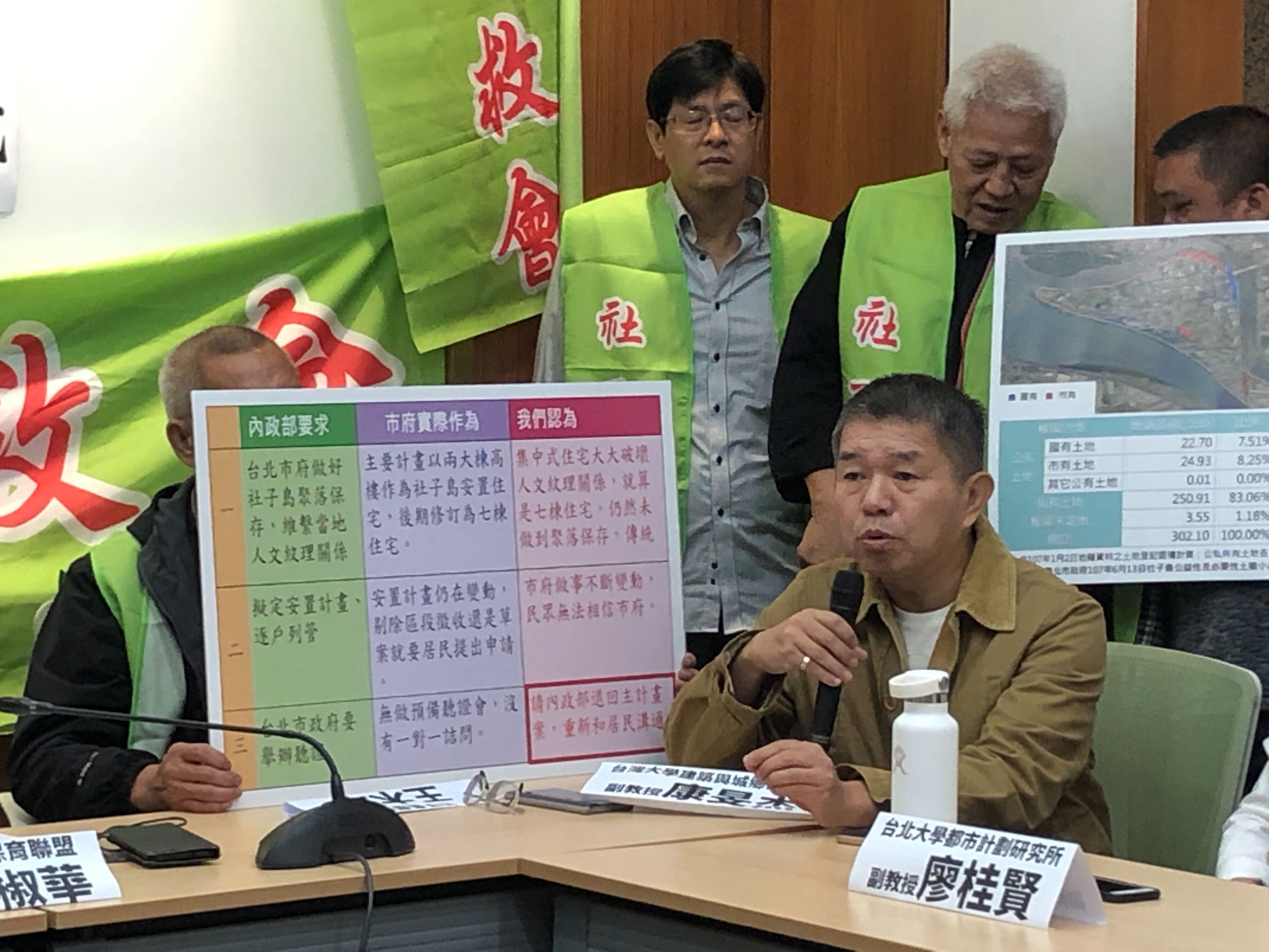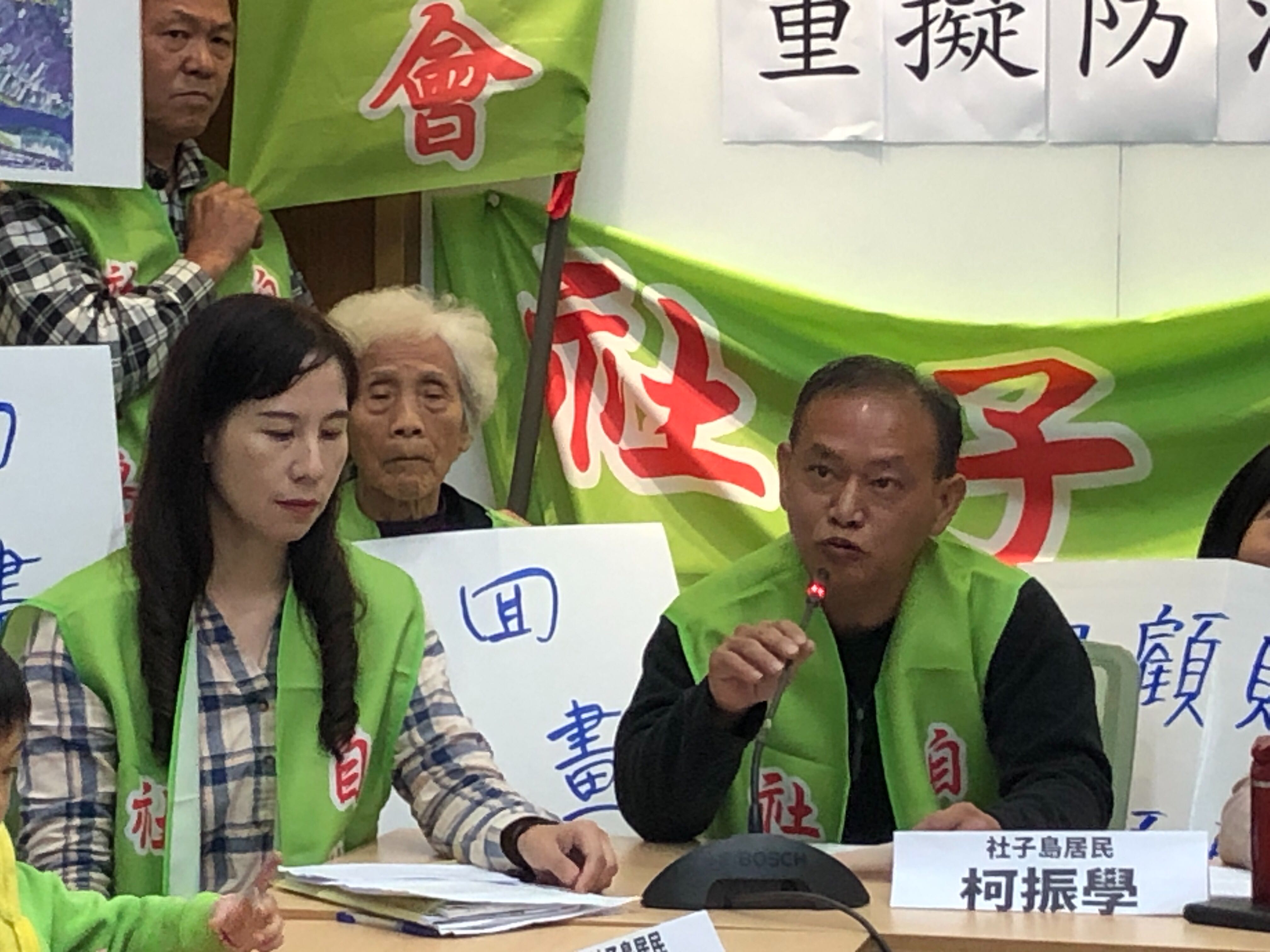 社子島居民柯振學指出,107年6月26日內政部通過社子島主計畫案,有附帶決議三個條件:包括聚落人文紋理要維持、安置計畫要合理安置理聽證會;若北市辦聽證會不夠徹底,內政部將可在辦聽證會。眼看社子島採全區區段徵收,將全區剷平,九大聚落將夷為平地,聚落無法保存;夜弄土地公、划龍舟、各大聚落間的信仰文化部將消失。而安置計畫的基礎——家戶訪查——不確實,社子島內4258戶,只調查2047戶,只佔百分之48.1。上半年短短的兩個月內就完成聽證程序;原本預計今年六月開預備聽證會,十月開正式聽證會,但台北市府卻急就章就完成聽證。因此,我們要求退回主計畫,反對區段徵收、停止環評!